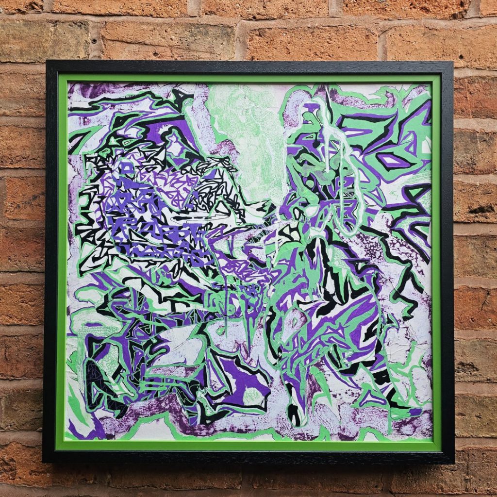 Framed in a double frame, green to compliment the artwork and an open grain sold black frame.